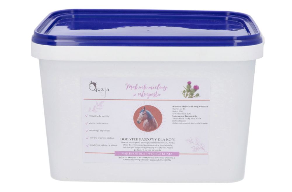 Makuch mielony może się lepiej sprawdzić w przypadku koni starszych, które mają problemy z gryzieniem granulatu. Łatwy w dawkowaniu i mieszaniu z paszą. Ostropest mielony zapakowany w wygodne wiaderko z pokrywką, dzieki czemu można w łatwy i wygodny sposób przechowywać produkt- bez rozsypywania.