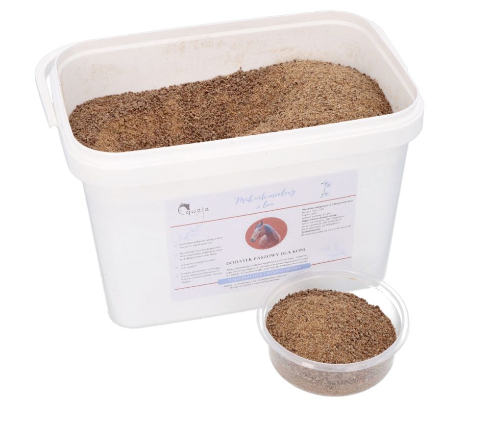Makuch lniany mielony to świetny dodatek paszowy dla koni sportowych, hodowlanych, rekreacyjnych oraz drobiu i trzody chlewnej. Makuch lniany mielony jest szczególnie wartościowy pod względem zawartości białka, tłuszczu oraz nienasyconych kwasów tłuszczowych. Białko zawarte w produkcie charakteryzuje się niezwykle dobrą jakością i przyswajalnością. Śluz powlekający nasiona lnu działa ochronnie na układ pokarmowy, łagodzi podrażnienia i stany zapalne, które najczęściej są spowodowane przekarmieniem paszami o wysokiej zawartości węglowodanów. Makuch lniany wyróżnia się wysoką zawartością kwasów Omega-3 i Omega – 6 oraz jest bogatym źródłem mikroelementów (cynku, jodu, fosforu, potasu, żelaza) i witamin z grupy B.