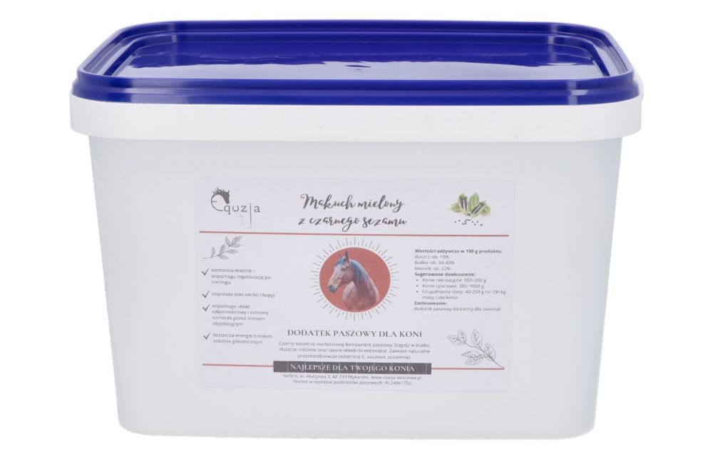 Makuch mielony z czarnego sezamu to świetny dodatek paszowy dla koni sportowych, hodowlanych, rekreacyjnych. Wyprodukowany w Polsce w wyniku tłoczenia oleju na zimno z wysokiej jakości ziaren sezamu. Pozyskiwany w sposób naturalny bez dodatków chemicznych.