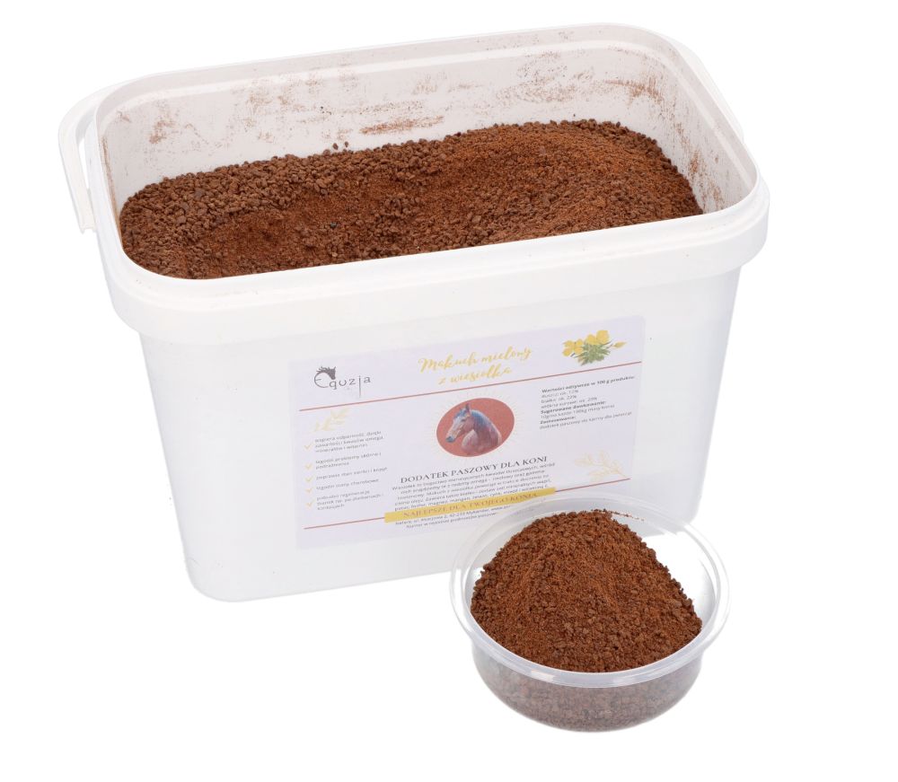 Makuch mielony z wiesiołka to świetny dodatek paszowy dla koni sportowych, hodowlanych, rekreacyjnych. Wyprodukowany w Polsce w wyniku tłoczenia oleju na zimno z wysokiej jakości ziaren wiesiołka. Pozyskiwany w sposób naturalny bez dodatków chemicznych.