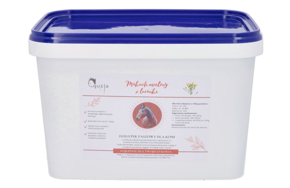 Makuch mielony z lnianki rydzowej to świetny dodatek paszowy dla koni sportowych, hodowlanych, rekreacyjnych oraz drobiu i trzody chlewnej. Wyprodukowany w Polsce w wyniku tłoczenia oleju na zimno z wysokiej jakości ziaren lnianki siewnej. Pozyskiwany w sposób naturalny bez dodatków chemicznych.